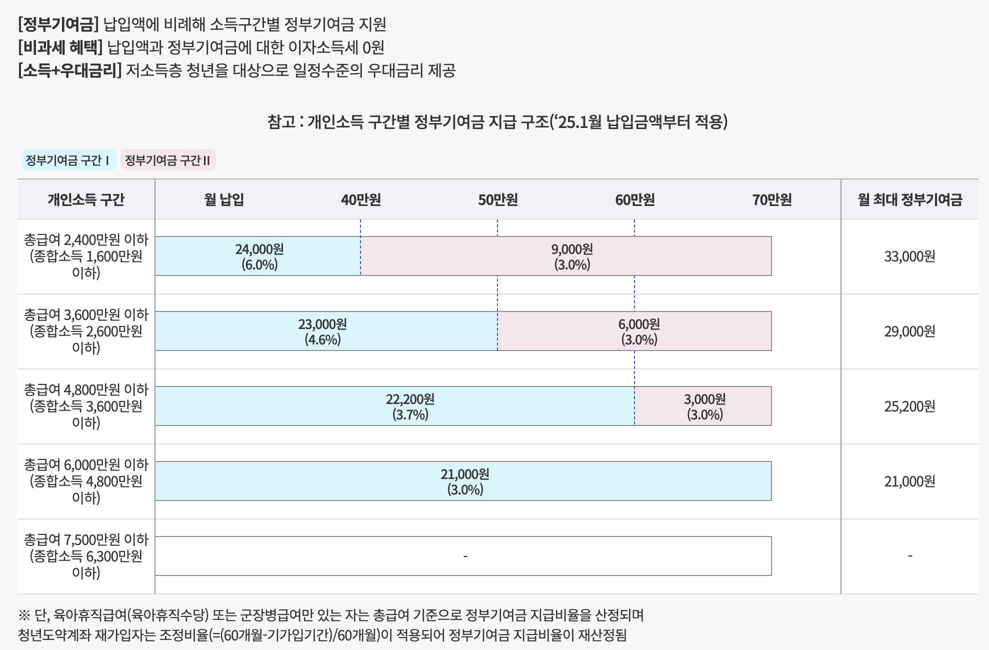 - 정부 기여금: 최대 월 4만~6만 원 (소득 구간별 차등 지원)