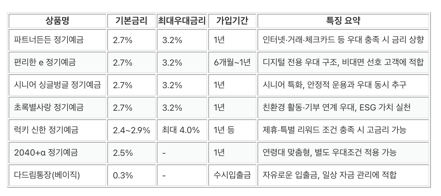 청년·중장년·시니어 등 고객군에 맞춘 전용·테마 상품이 제공됩니다. 단순한 금리 경쟁을 넘어 생활 패턴(디지털 이용, 체크카드 실적), 가치 소비(친환경·기부)와 연계된 우대 구조를 통해 “금리 + 의미”를 동시에 추구할 수 있습니다.