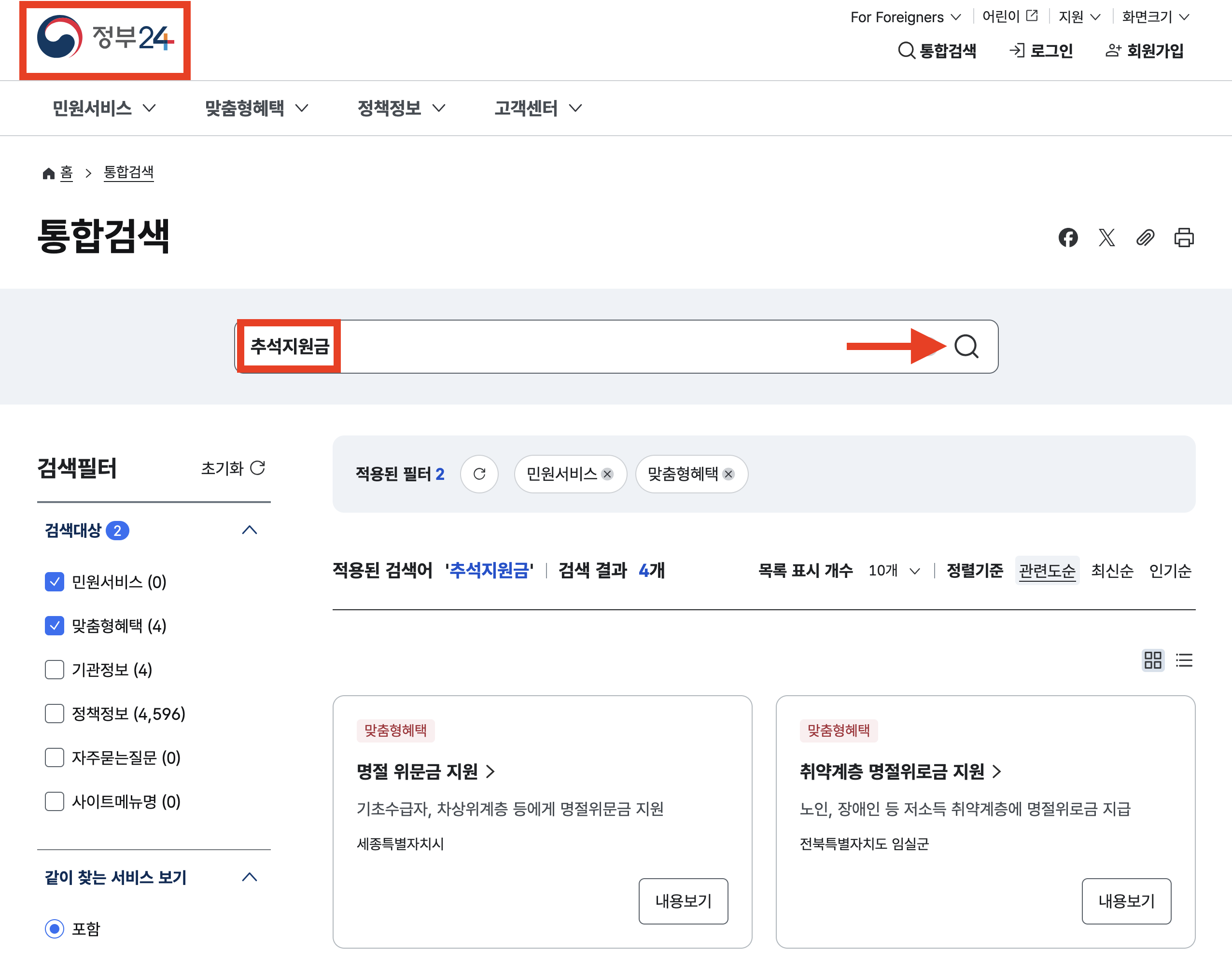 내가 해당하는 지자체 복지 부서 공지를 반드시 확인해야 하며 정부24 홈페이지에서 명절지원금(추석지원금)을 검색해서 확인할 수도 있습니다.