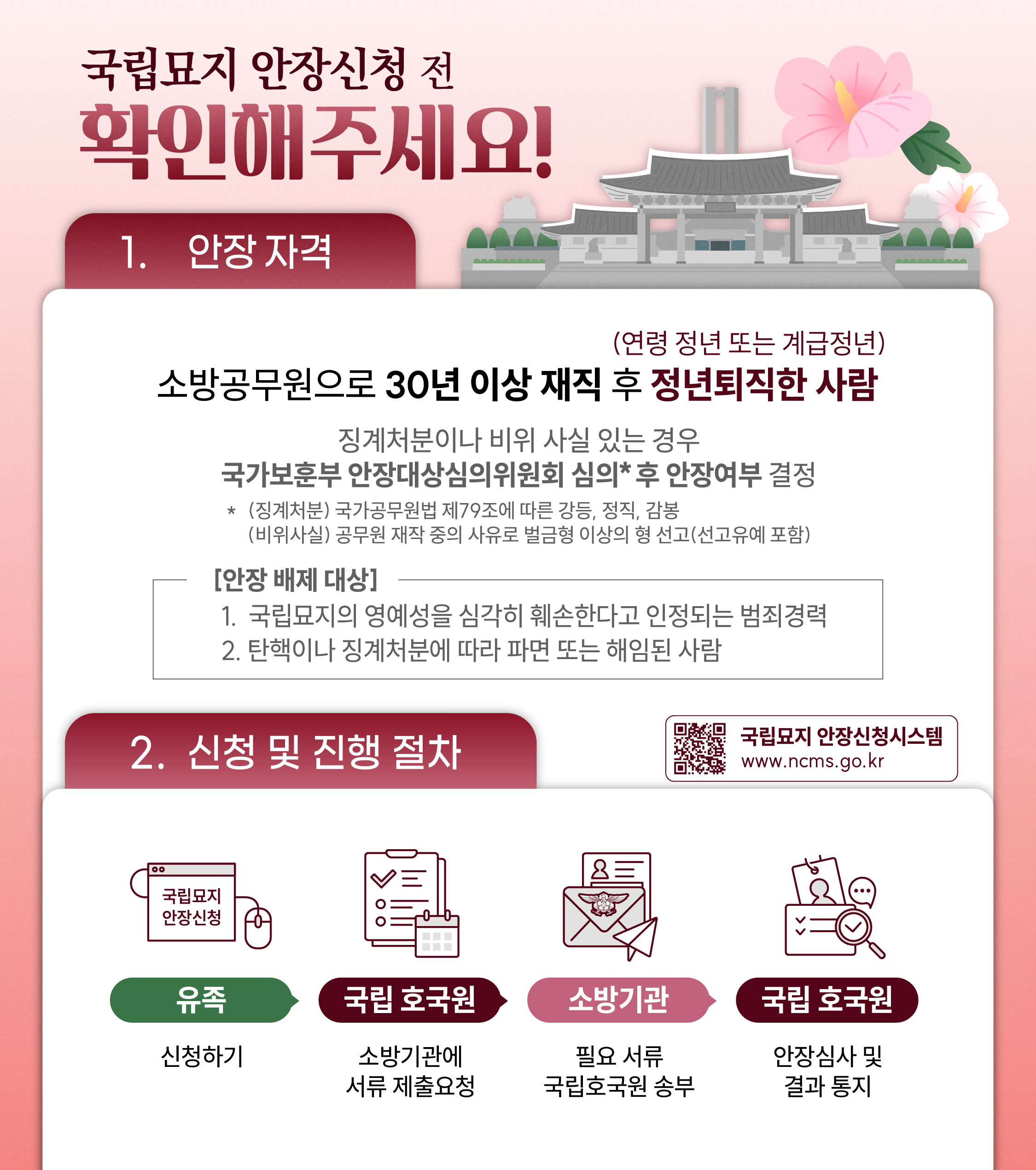 | 신청 방법 | [국립묘지 안장신청시스템(ncms.go.kr)] → 소방기관 서류 전달 → 심사 |