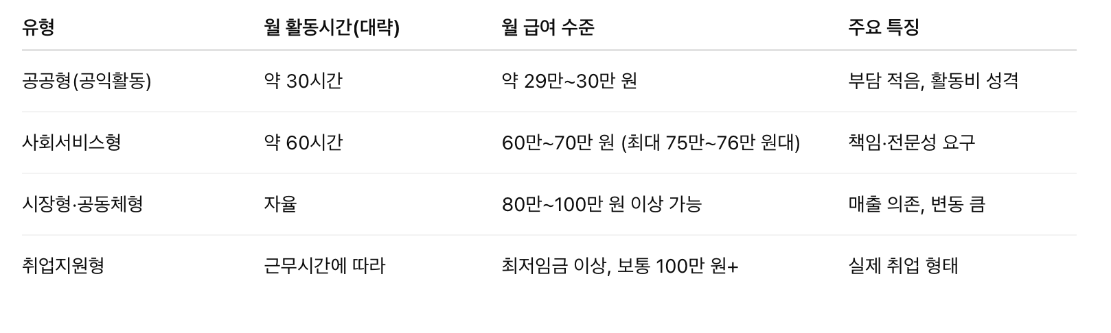 시장형은 안정성은 상대적으로 낮지만, 운영이 잘 되는 사업단에 속할 경우 다른 유형보다 높은 수입을 기대할 수 있습니다. 다만 지역, 사업단 성과, 참여 인원 등에 따라 수익 차이가 크므로, 신청 전 해당 사업단의 운영 현황을 확인하는 것이 중요합니다.