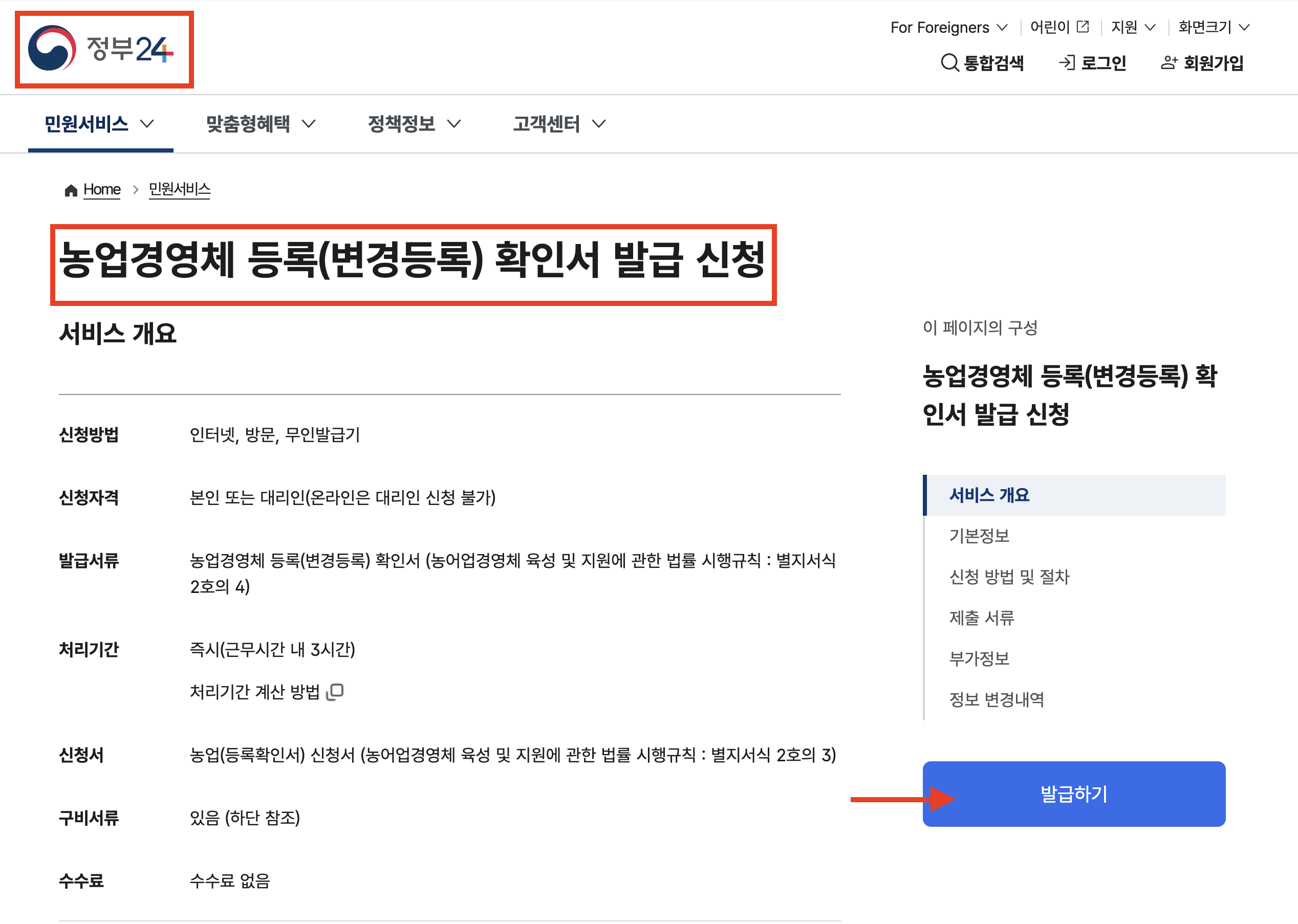 얼마전까진 농업경영체 통합정보시스템에서 발급이 가능했으나 현재는 정부 24에서만 본인 인증 후 출력 가능합니다.