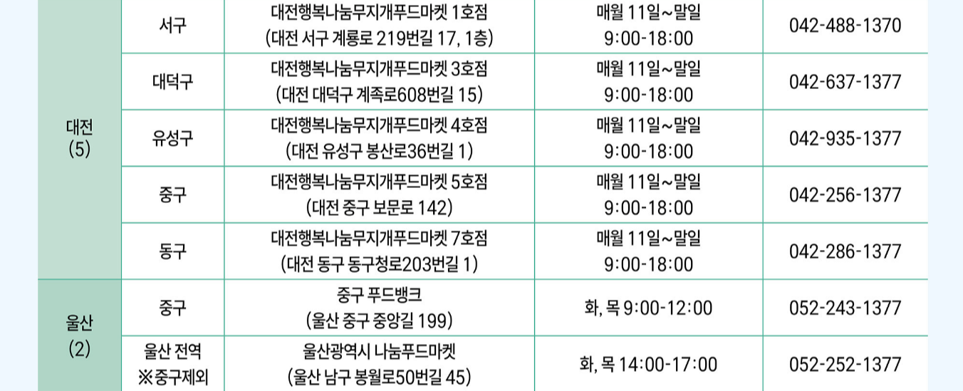 많은 곳이 ‘푸드마켓 ○○점’ 또는 ‘푸드뱅크 ○○센터’로 등록되어 있습니다.